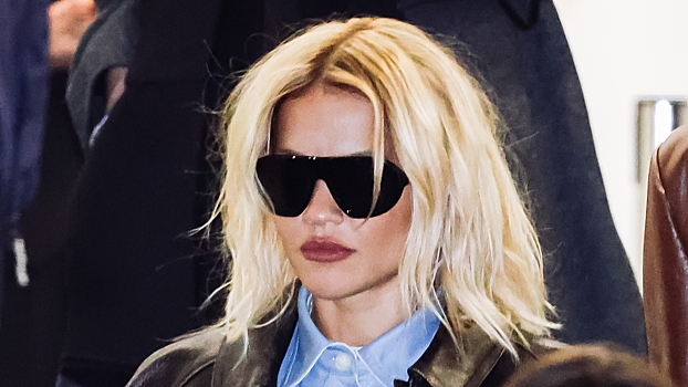 Рита Ора позировала в голубом мини-платье с голыми ногами. Образ дополнили серые носки, туфли с острым мысом, солнцезащитные очки и сумка-мешочек из черного атласа. Волосы ей выпрямили и сделали легкий макияж с бежевой помадой.