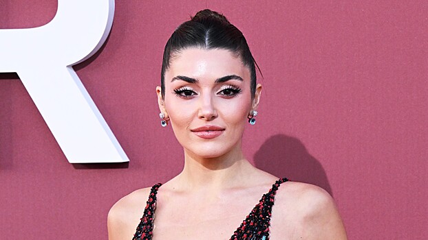 Ханде Эрчел позировала в сером мини-платье, которое дополнили акцентные розовые перчатки, золотые серьги и туфли на платформе. Волосы ей уложили крупными локонами и сделали вечерний макияж.