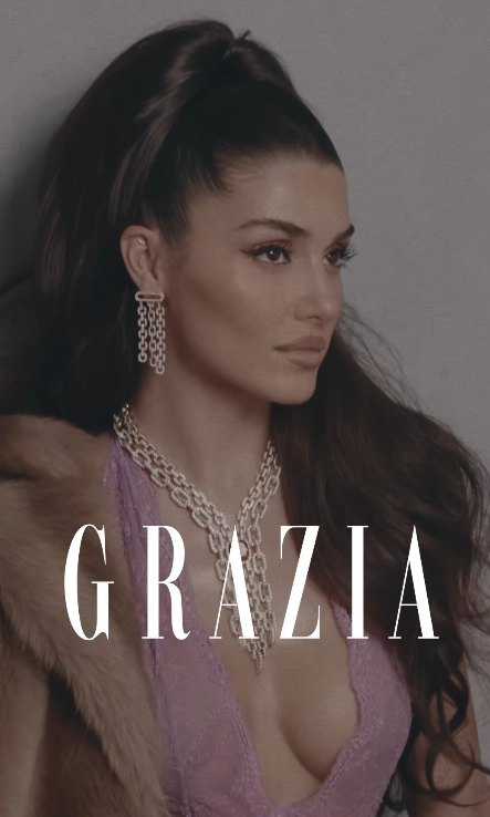 Ханде Эрчел позировала в атласном розовом бюстгальтере, белом топе и серой юбке, лежа на постели. Волосы ей уложили в высокий хвост и сделали макияж в ретро стиле.