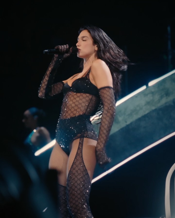 29-летняя исполнительница предстала перед зрителями в черном блестящем наряде, состоящем из боди с прозрачными вставками и ботфортов из аналогичного материала. При этом Липа отказалась от штанов.