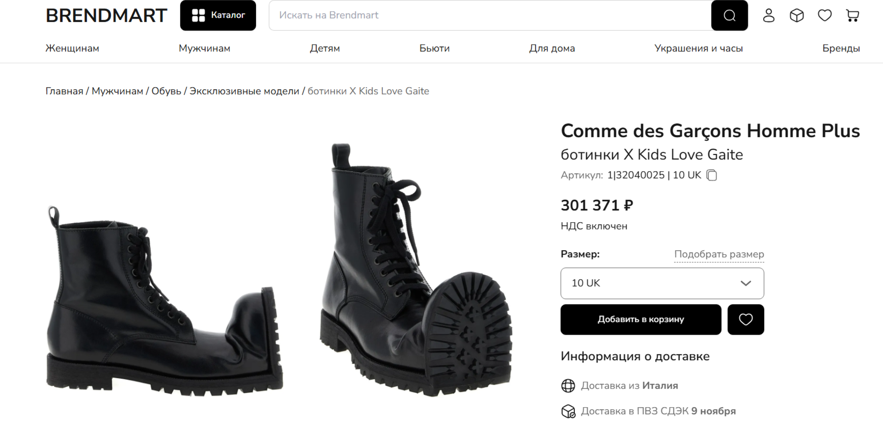 Comme des Garçons презентовал данные ботинки в январе 2025 года. Пока они не поступили в продажу, но известна стоимость похожей детской обуви. На зарубежных сайтах цена доходит до 300 тыс. рублей.