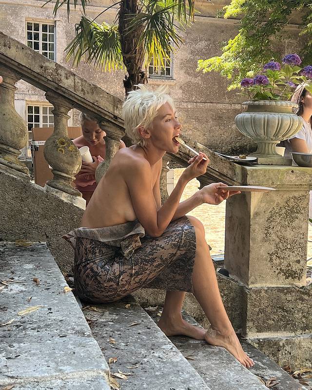 24-летняя манекенщица поделилась снимками со съемки для нового выпуска CR Fashion Book. Так, наследницу актера запечатлели в облегающем платье с расстегнутым верхом во время перерыва. Она сидела на лестнице с голой грудью, держа в руках ложку и тарелку.