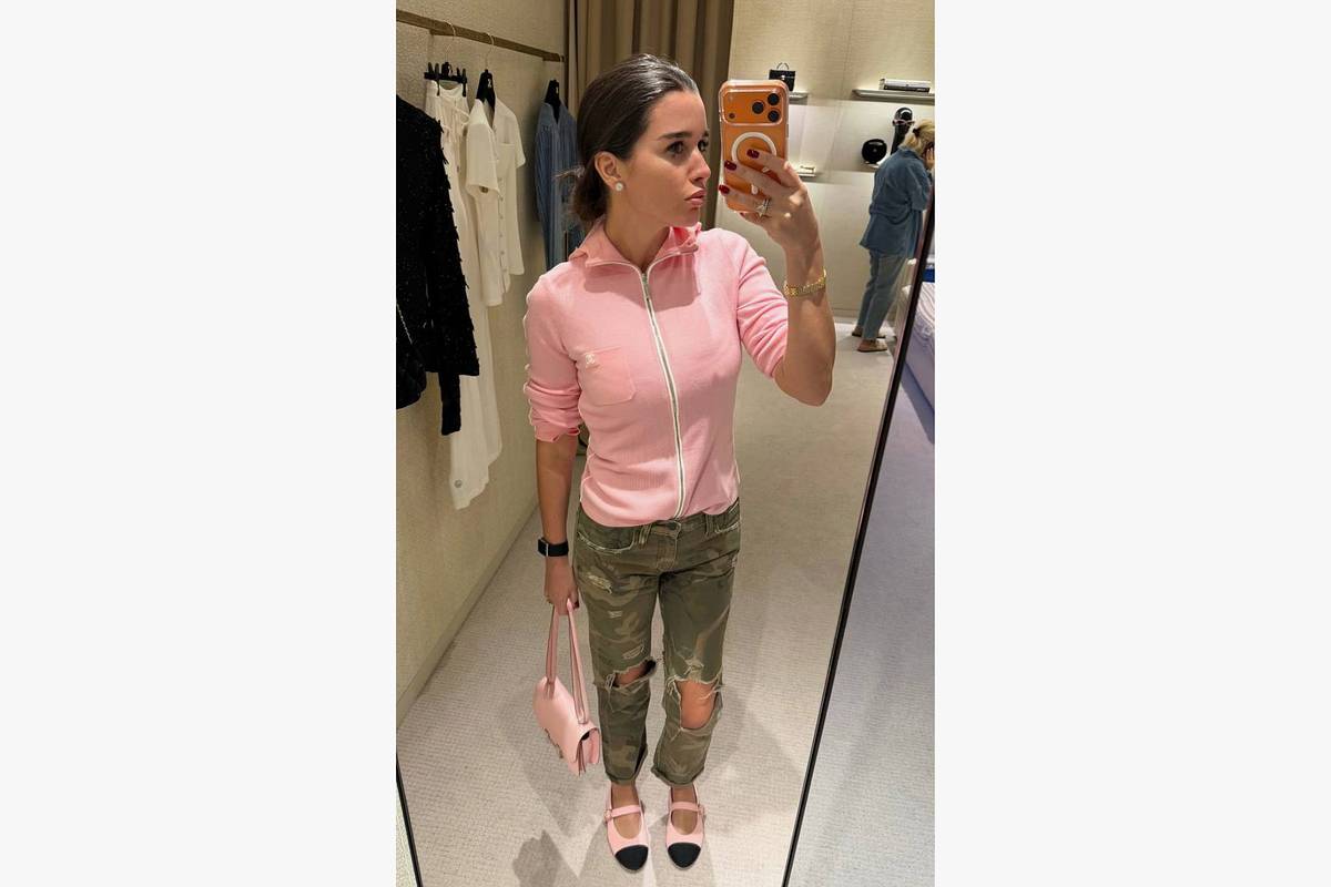 На опубликованном снимке знаменитость позировала в рваных штанах с камуфляжным принтом и розовой кофте Chanel. Помимо этого, звезда надела туфли с черным носом того же бренда за 195 тысяч рублей.