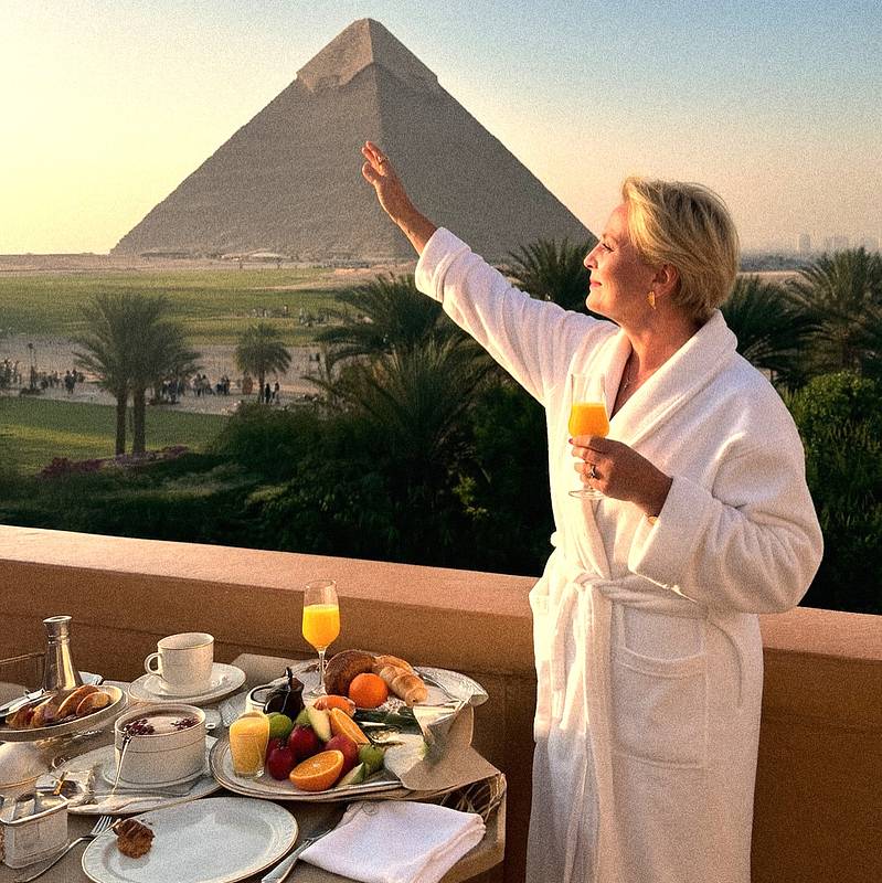 53-летняя звезда «Интернов» отправилась на отдых в Египет. Она предстала на размещенном кадре, стоя на открытом балконе на фоне пирамиды. Знаменитость позировала в белом банном халате с поднятой рукой.