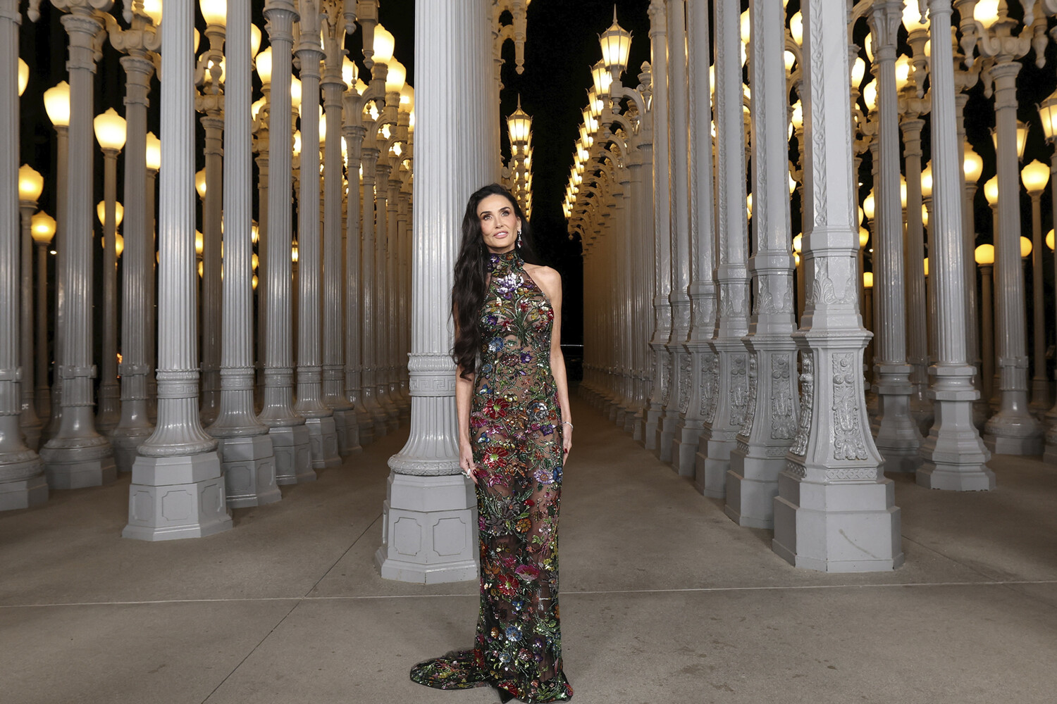 62-летняя Деми Мур посетила 14-й ежегодный гала-вечер «Искусство и кино», который состоялся 1 ноября в Лос-Анджелесе. Актриса вышла на публику в полупрозрачном макси-платье с цветочной вышивкой и пайетками. Артистка также надела туфли на каблуках, браслет, кольцо и серьги. Визажист сделал знаменитости вечерний макияж с коричневыми тенями и розовой помадой, а стилист уложил волосы в локоны.