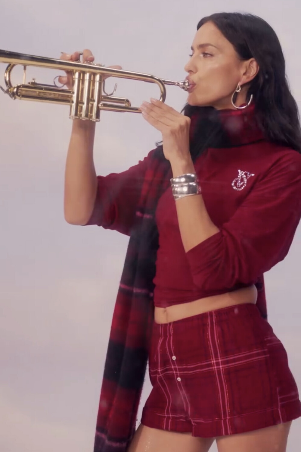 39-летняя Ирина Шейк приняла участие в съемках праздничной рекламной кампании бренда «Victoria's Secret». В ролике супермодель имитировала игру на саксофоне. Манекенщица позировала перед камерой в красном свитере и пижамных шортах в полоску. Образ звезды подиумов дополнили массивные серьги, браслеты и длинный шарф. Ирине Шейк уложили волосы в локоны и сделали макияж в естественном стиле.
