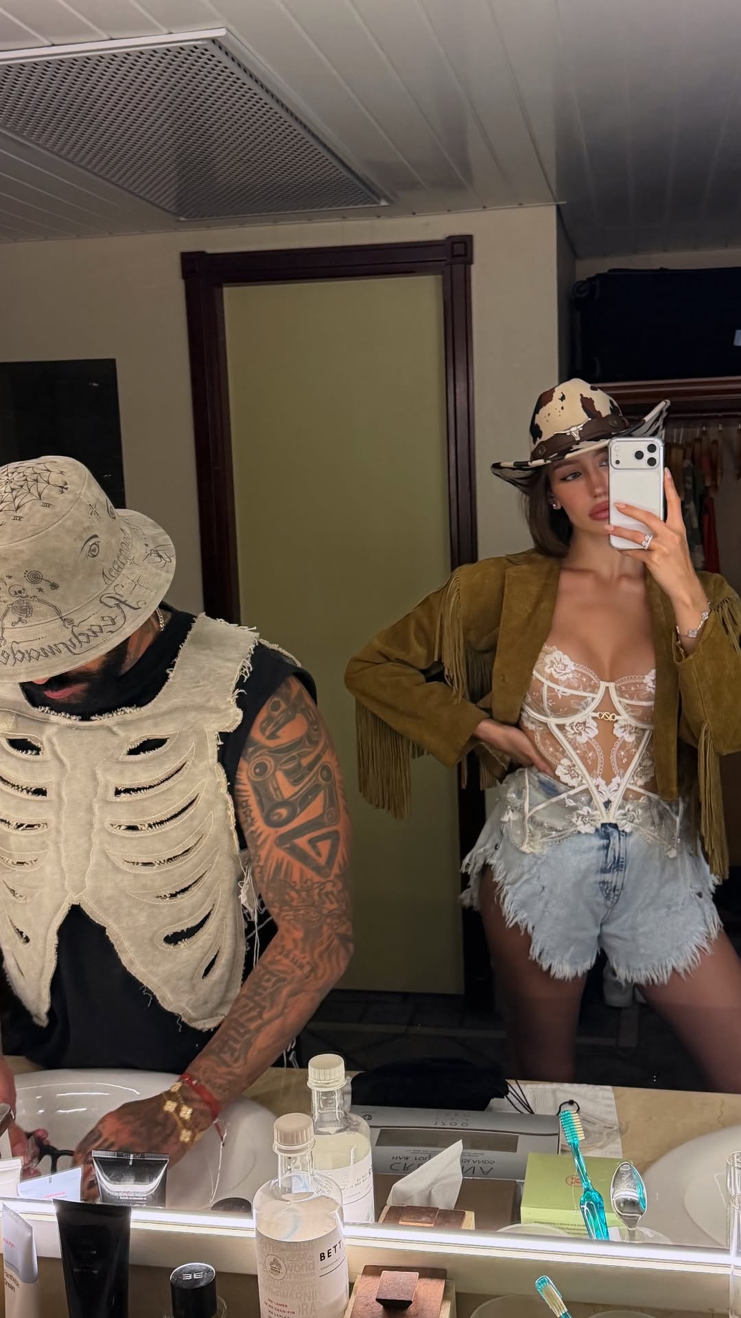 Валентина Иванова позировала в белом кружевном корсете, джинсовых шортах и куртке из замши. Образ дополнила ковбойская шляпа. Тимати также примерил образ в кантри стиле в белом жилете и панаме. Пара позировала в ванной перед зеркалом.